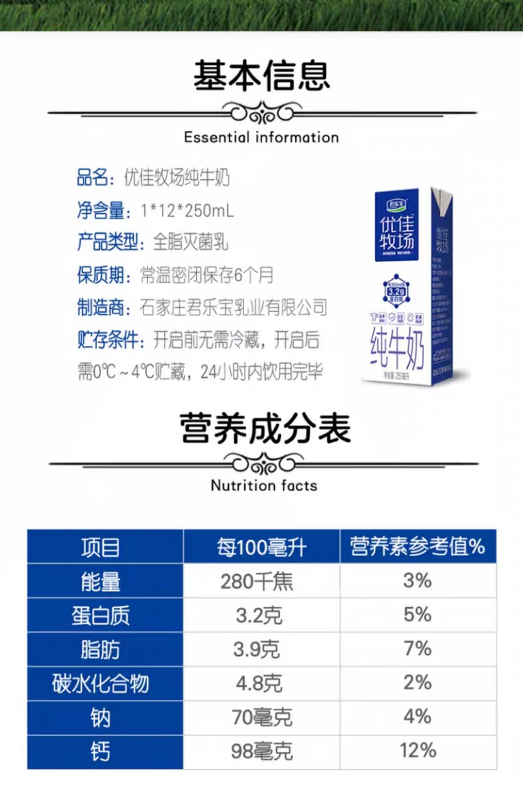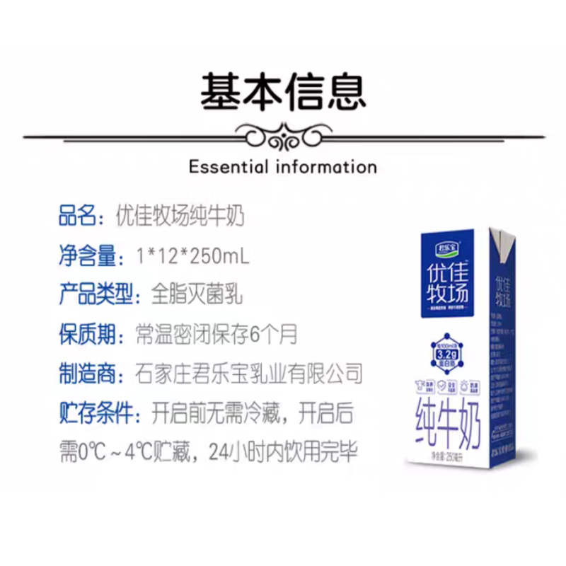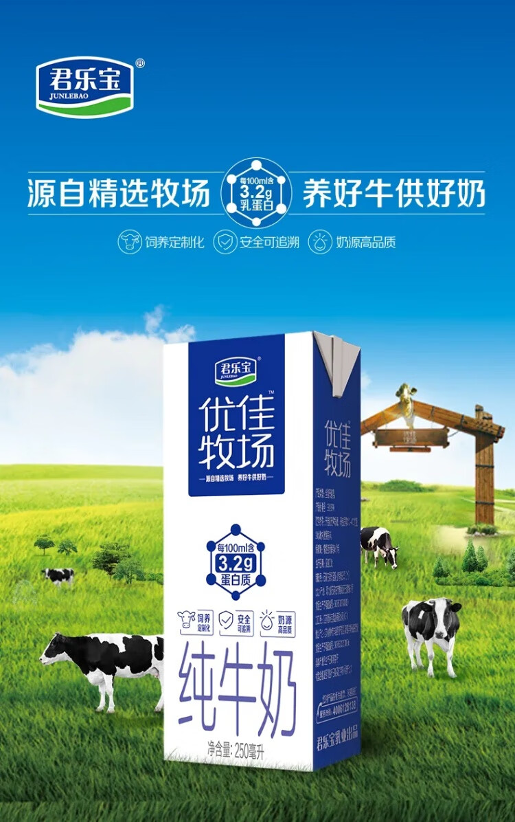 君乐宝优佳牧场纯牛奶(原味)利乐砖250ml*12