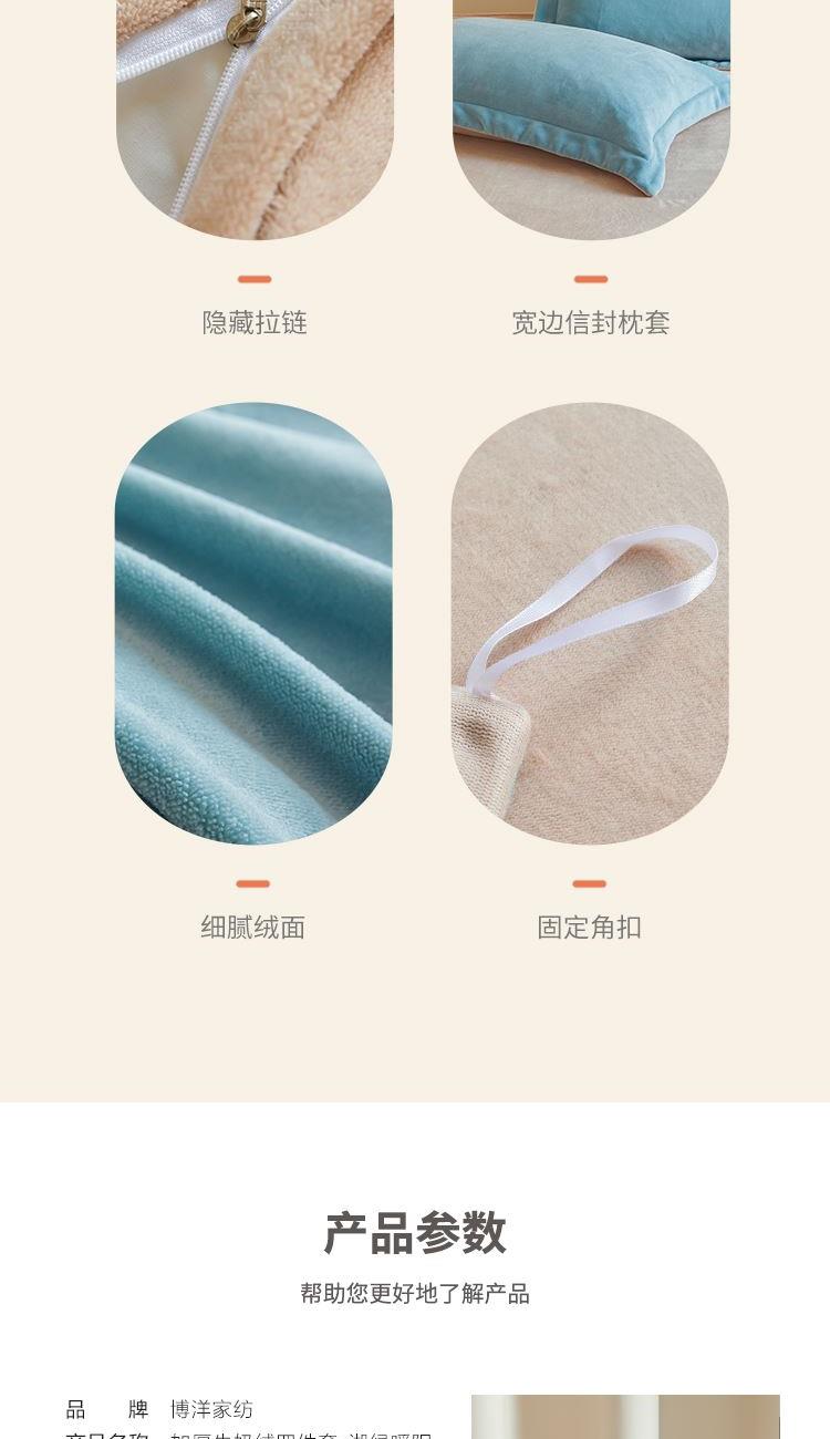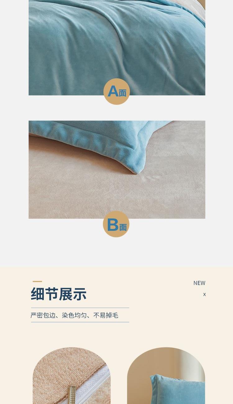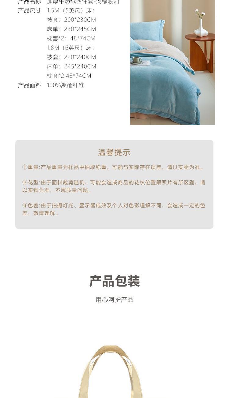 产品规格:1.5m(5英尺)床: 被套:200*230cm 床单:230*245cm 枕套*2:48*74cm 产品材质:聚酯纤维 净重约:3600g 毛重(含包装)约:3900g 1、本品采用高克重牛奶绒面料,手感软糯绒毛细密。高密度的绒能够把温度锁在绒面和身体之间,蓄热保暖效果好。面料镶嵌导电丝,有效抗静电。 2、AB面双色两用设计,纯色简约百搭,适配各种风格的家居。 3.精湛印染工艺,色牢度高,床品机洗方便,不易褪色不易起球呵护健康睡眠。