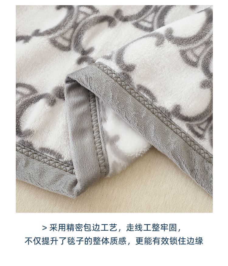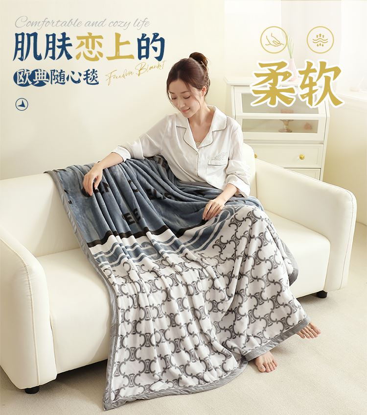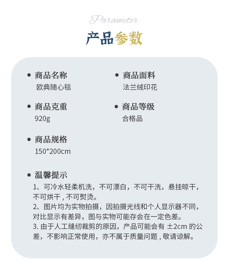 品 名:欧典随心毯 型 号:HS-T-XW17102 面 料:法兰绒印花 规 格:150*200cm/920g 产品说明: 1.朴素简约的印花活性印染,色泽靓丽,垂悬感佳,色布直角宽包边工艺,毯型线条流畅,水晶超柔面料亲肤性更强,铺盖效果更优; 2.280克平方克重,手感更密实,适用于车载、办公、家居等各空间,折叠收纳方便,为宏石家纺促销、积分爆款毯型,可作薄毯春秋被铺盖,适合一年四季使用。