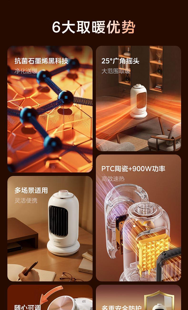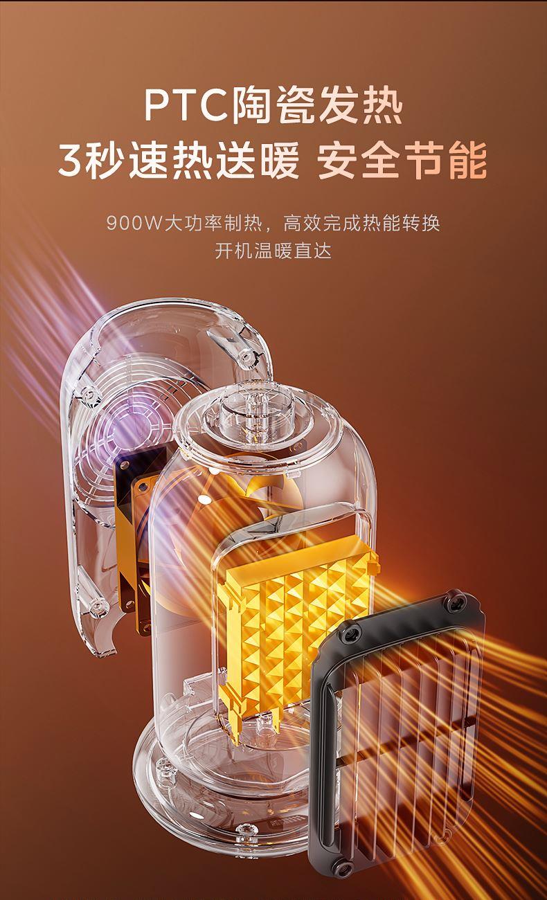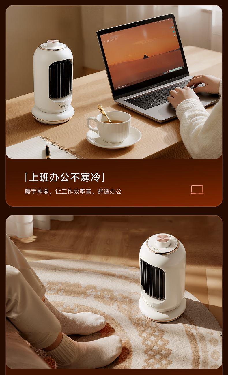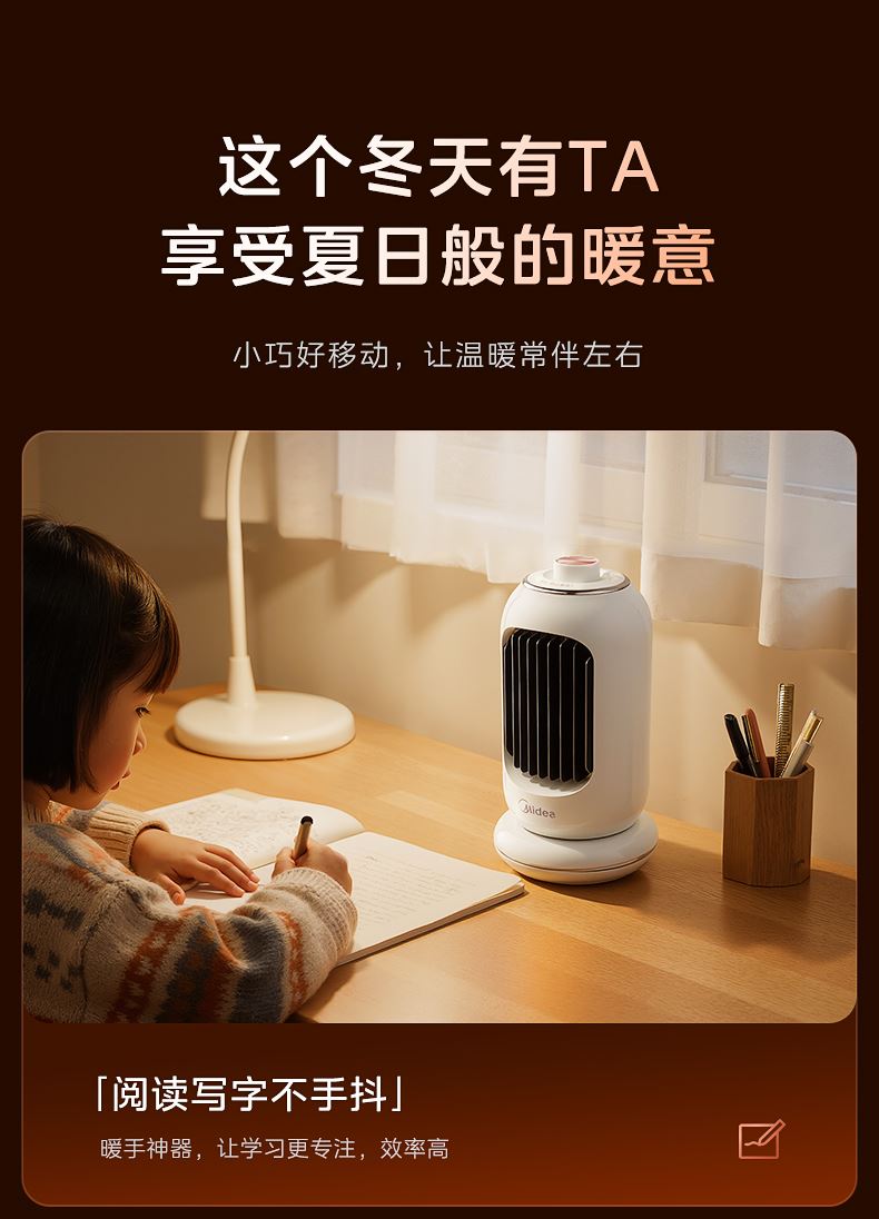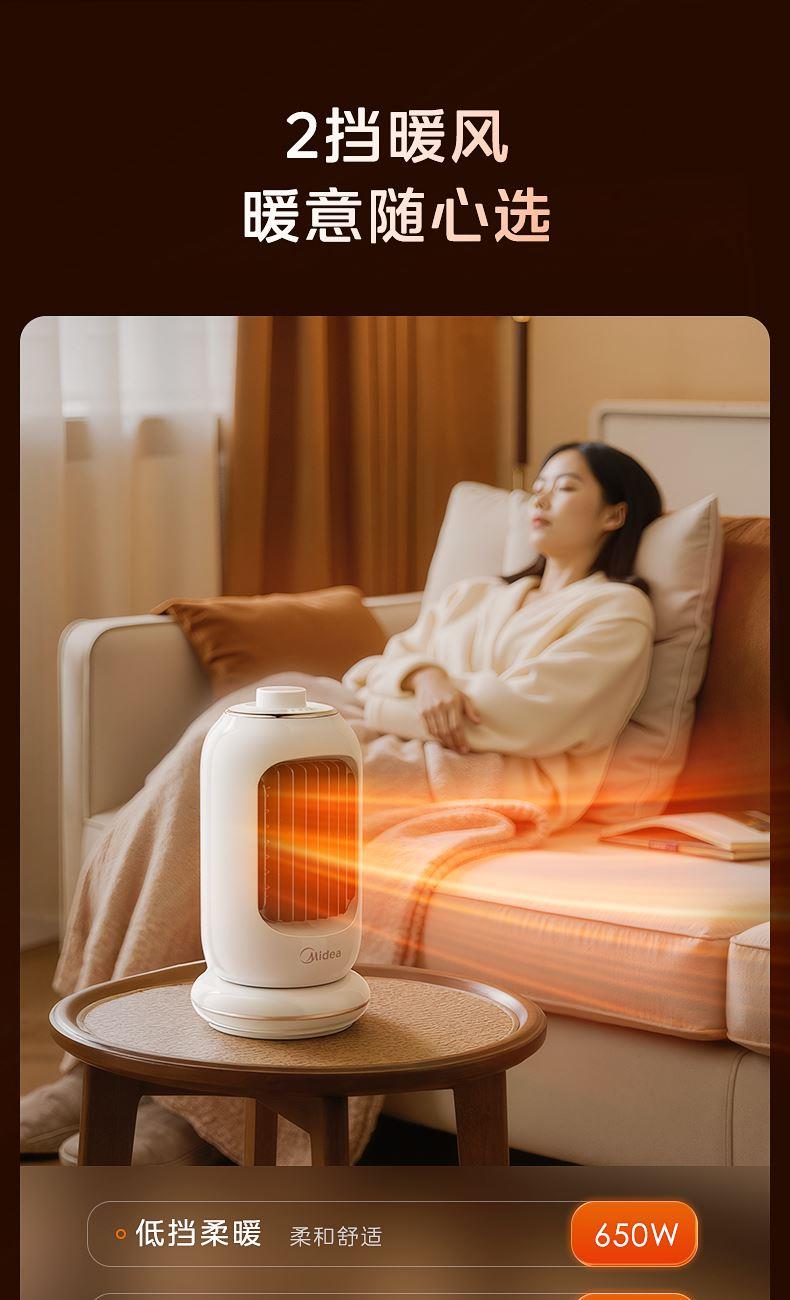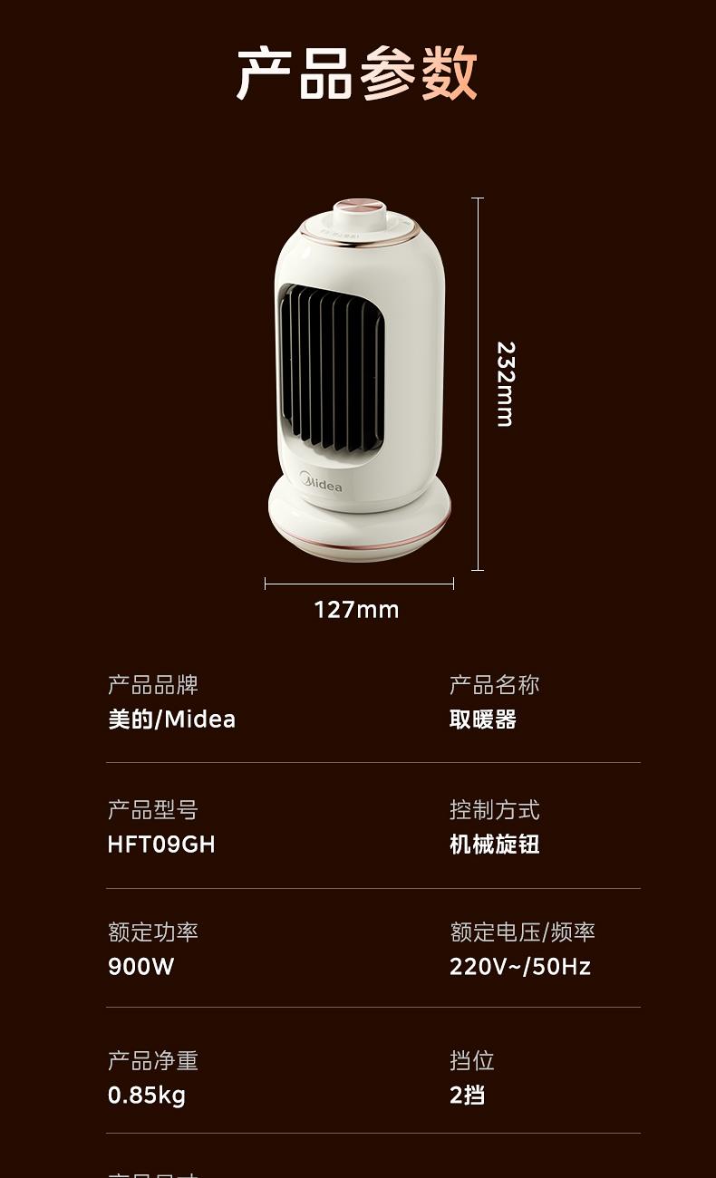 包装尺寸:140 x 140 x 265 mm 商品尺寸:127 x 127 x 233 mm 毛重:1.03 kg 【速热】核心搭载PTC陶瓷发热体,900W高效出暖,无明火,无亮光,开机3秒即出暖风,温暖无需等待; 【两挡可调】2挡暖风,暖意随心选; 【便捷移动】小巧机身,哪里需要拎哪里(办公、书房、浴室等场景); 【便捷操控】顶部机械式大旋钮操控,人性化设计; 【大范围取暖】左右摇头,广角度送暖;