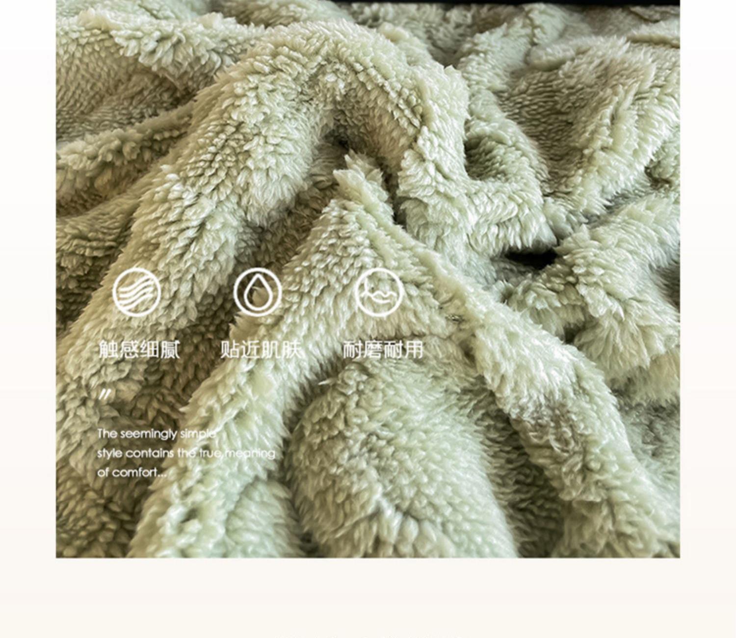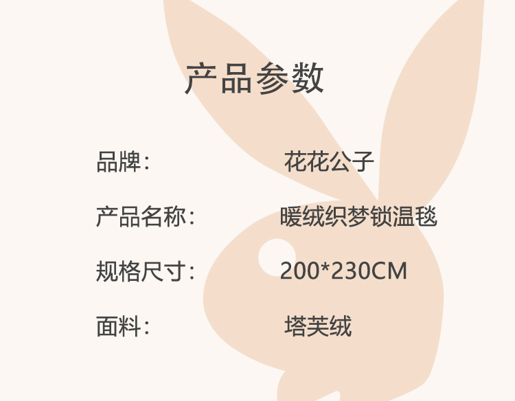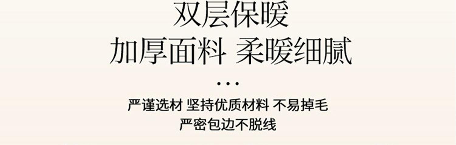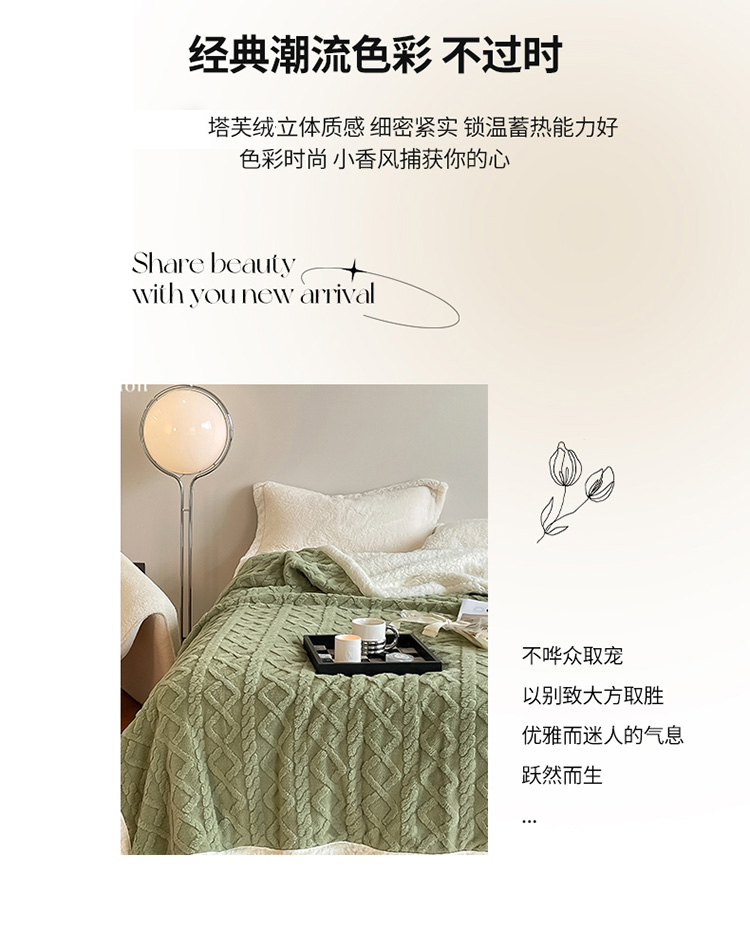 规格:200*230cm 面料:塔芙绒 克重:1700g 执行标准:FZ/T61002-2019 安全类别:GB18401-2010 B类 1.严选塔芙绒面料,手感细腻,亲肤舒适,速热保暖;高克重塔芙绒,透气吸湿,保暖性更好,快速升温;2.内置导电纱,防静电处理,使用更安心;精致的卷工艺,做工精细,针脚细密,不易脱线,牢固耐用。
