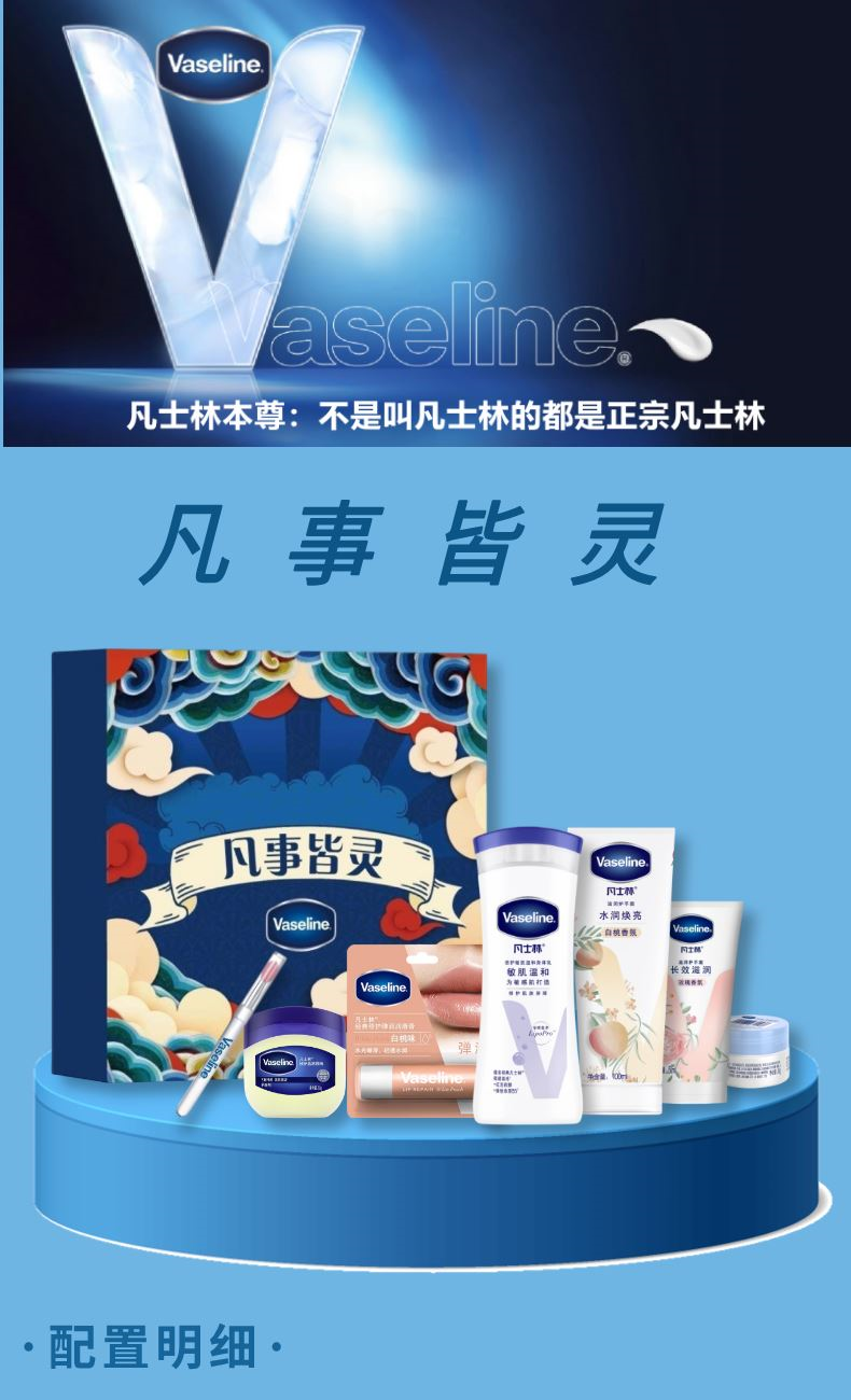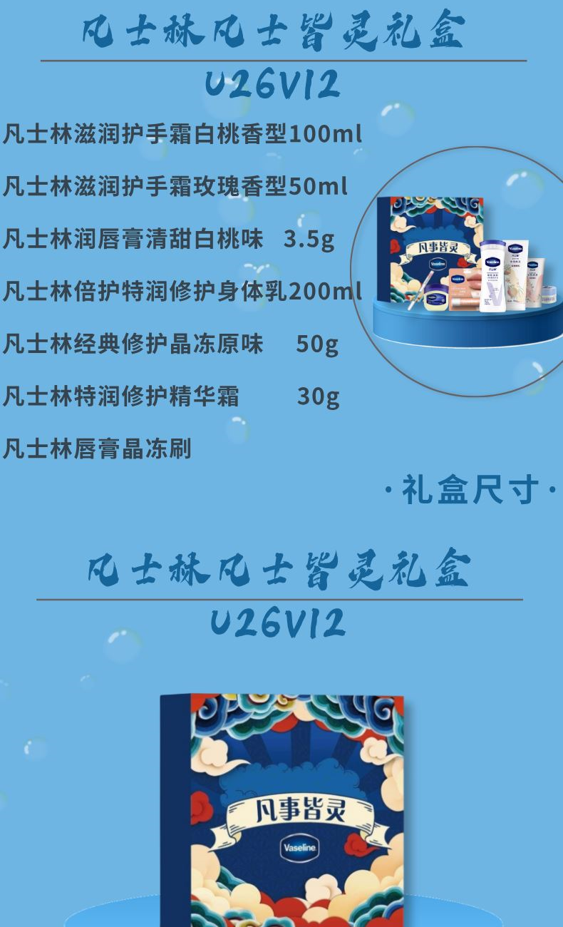 凡士林滋润护手霜白桃香型 100ml 凡士林滋润护手霜玫瑰香型 50ml 凡士林经典修护弹润润唇膏清甜白桃味 3.5g 凡士林倍护特润修护身体乳清香型 200ml 凡士林经典修护晶冻原味 50g 凡士林特润修护精华霜 30g 凡士林唇膏晶冻刷 包 装 :彩盒 重 量 :1055g 礼盒尺寸:315*245*65mm