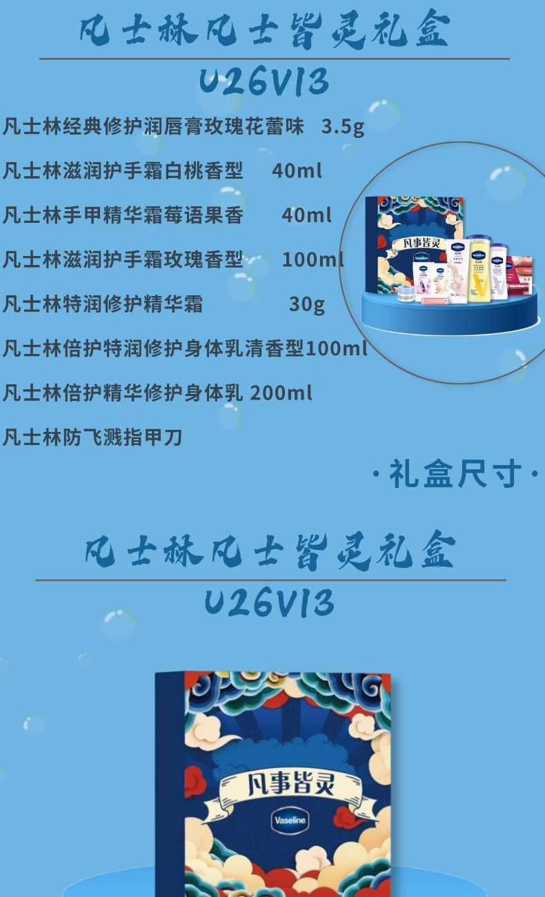 凡士林经典修护焕采润唇膏玫瑰花蕾味 3.5g 凡士林滋润护手霜白桃香型 40ml 凡士林保湿莹亮手甲精华霜莓语果香 40ml 凡士林滋润护手霜玫瑰香型 100ml 凡士林特润修护精华霜 30g 凡士林倍护特润修护身体乳清香型 100ml 凡士林倍护精华修护身体乳 200ml 凡士林防飞溅指甲刀 包 装 :彩盒 重 量 :1181g 礼盒尺寸:315*245*65mm